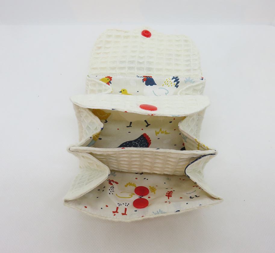 Réalisé à la main en coton nid d’abeilles beige et intérieur coton motif poules, fermeture par boutons pressions